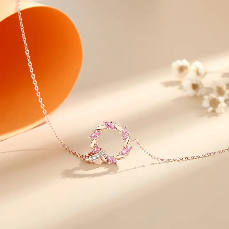 • Wheat Ear Interlocking Zircon Rose Gold Diamond Circle Pendant Necklace For Women Girl Gift